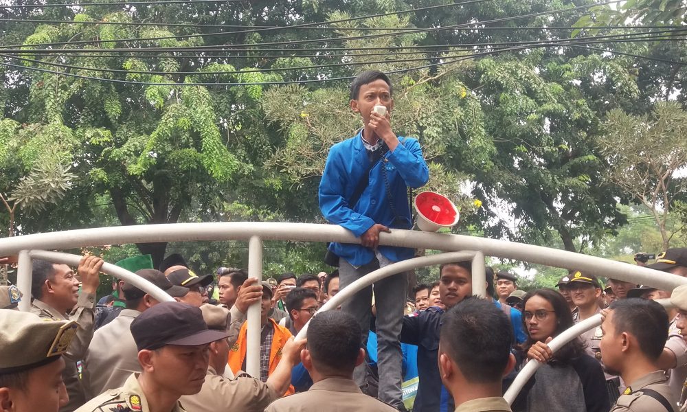 Dalam aksi ini, sejumlah mahasiswa sempat memaksa masuk dengan memanjat pagar yabg dijaga oleh petugas kepolisian dan Saptol PP.