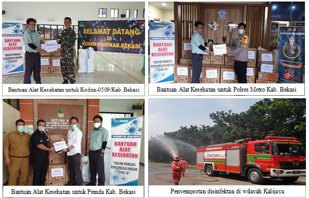 Bantuan itu meliputi semprotan disinfektan, sarung tangan medis, hand sanitizer, multivitamin, masker dan APD medis untuk Polres Metro Bekasi, Kodim 0509, dan Pemkab Bekasi, Desa Kalijaya dan desa Harjamekar.