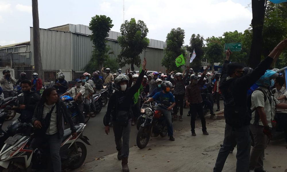 “Keluar semuanya,” teriak salah satu massa aksi yang merangsak masuk pabrik di kawasan MM2100, Cikarang, Kabupaten Bekasi.