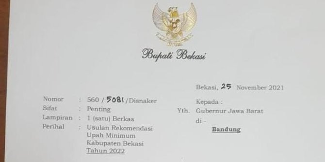 Dalam surat bernomor : 560/5081/Disnaker itu, UMK 2022 Kabupaten Bekasi diusulkan menjadi Rp5.055.875, atau naik dari upah minimum 2021 sebesar Rp4.791.843.
