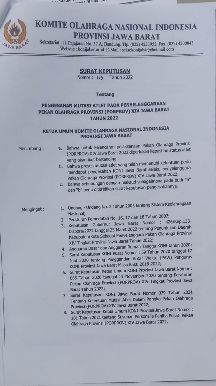 Sementara, Kepala Bidang Organisasi KONI Kota Bekasi, Ali Akbar menyesalkan keluarnya SK Ketum KONI Jabar Nomor 119/2022 tentang pengesahan mutasi atlet.