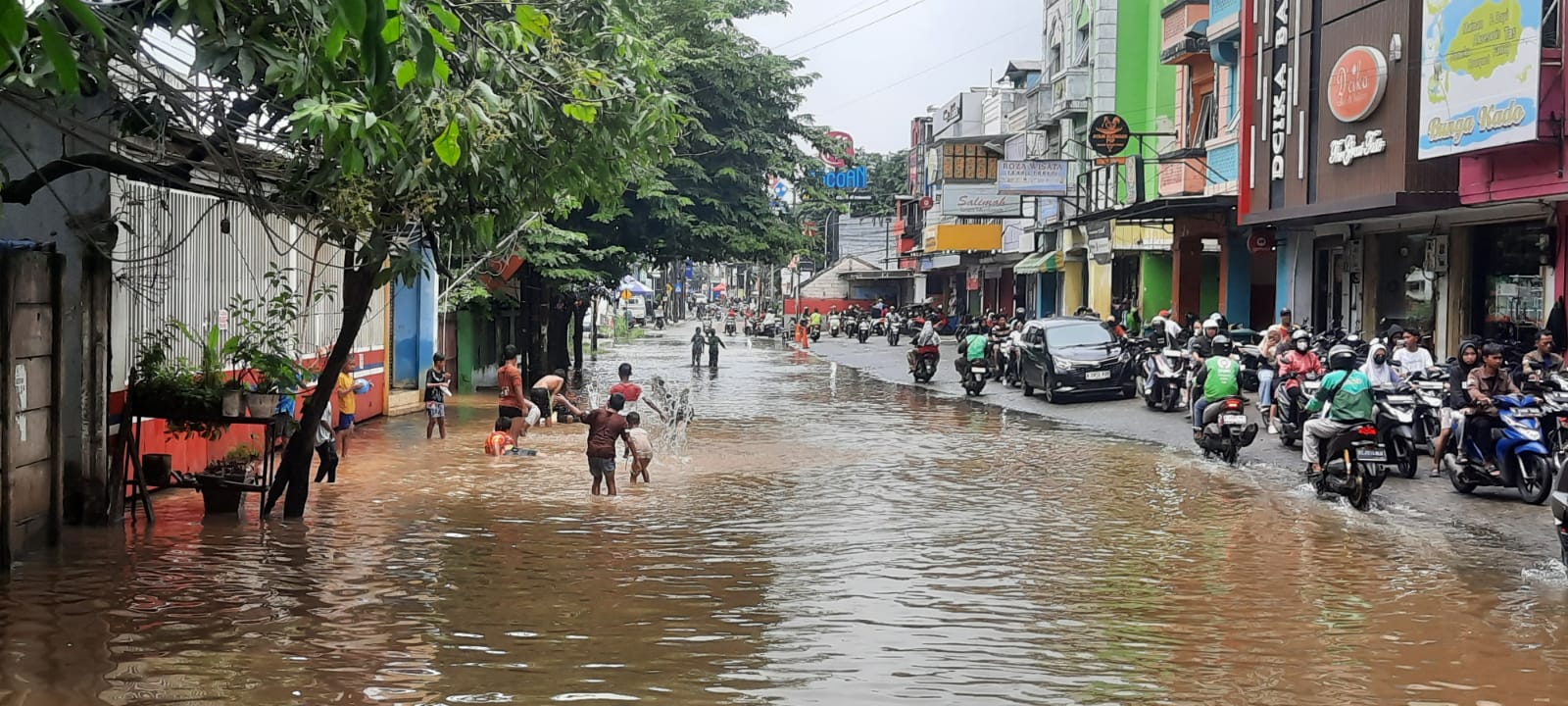 Ketinggian air di lokasi diperkirakan mencapai 20 hingga 30 sentimeter, mengganggu aktivitas dan arus lalu lintas pengguna jalan.