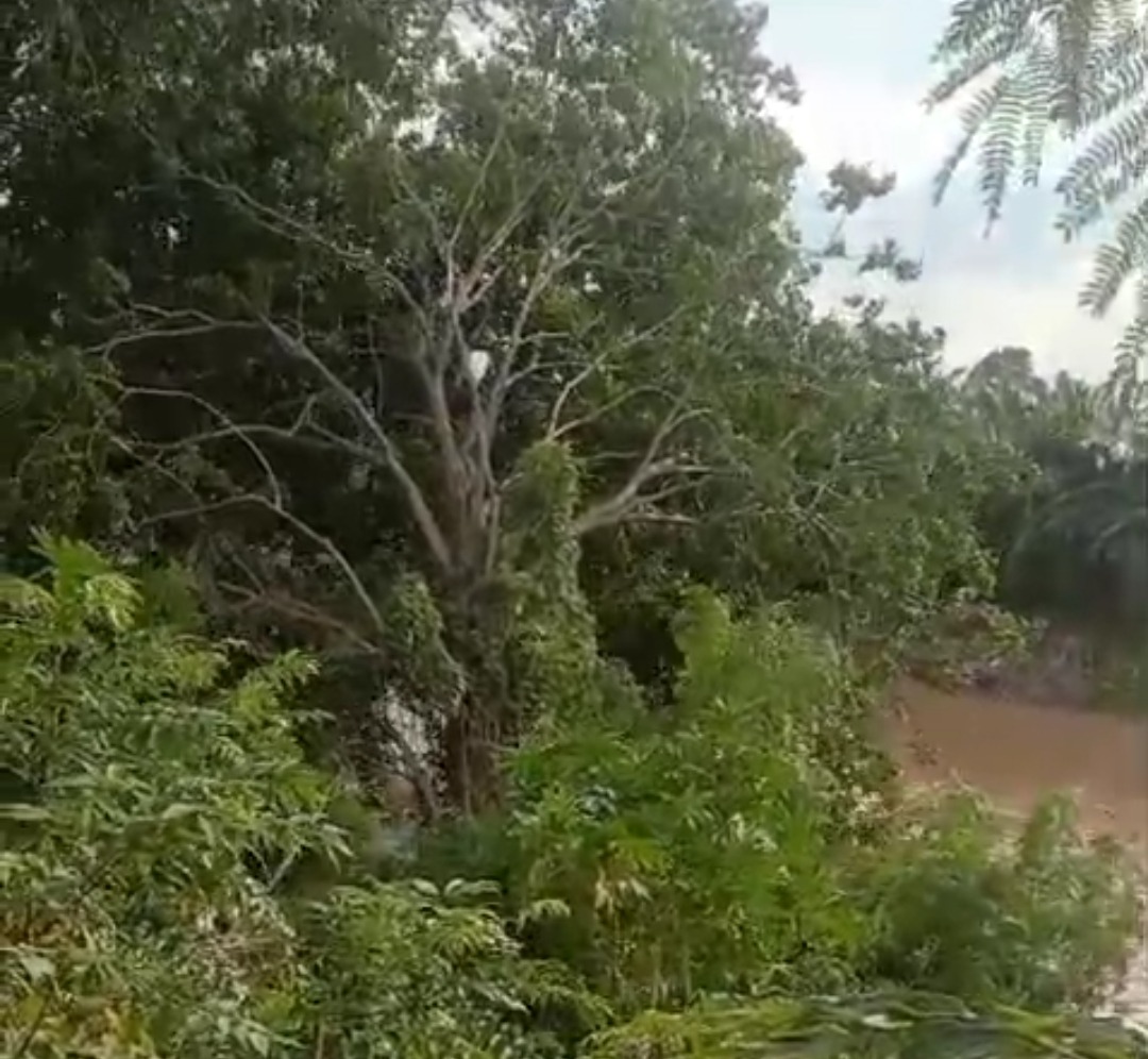 Tekanan arus yang membawa material kayu dan lumpur akhirnya memicu tumbangnya satu pohon besar yang berada di tepi sungai.