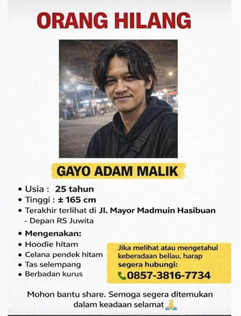 Pihak keluarga masih terus melakukan pencarian dan berharap bantuan masyarakat. Bagi siapa pun yang melihat atau mengetahui informasi terkait keberadaan Gayo Adam Malik, dapat menghubungi nomor 0857-3816-7734.