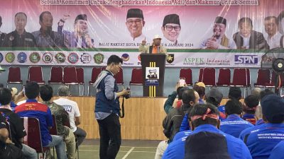 Ratusan buruh yang tergabung dalam Federasi Poros Buruh Bekasi Raya menggelar deklarasi untuk mendukung Pasangan…