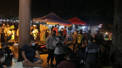 Petugas gabungan atau unsur tiga pilar dari TNI/Polri dan Satpol PP Kota Bekasi membubarkan warga…